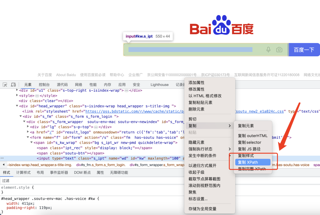 鼠标点击百度输入框即可定位到输入框元素,右键点击复制该元素的Xpath