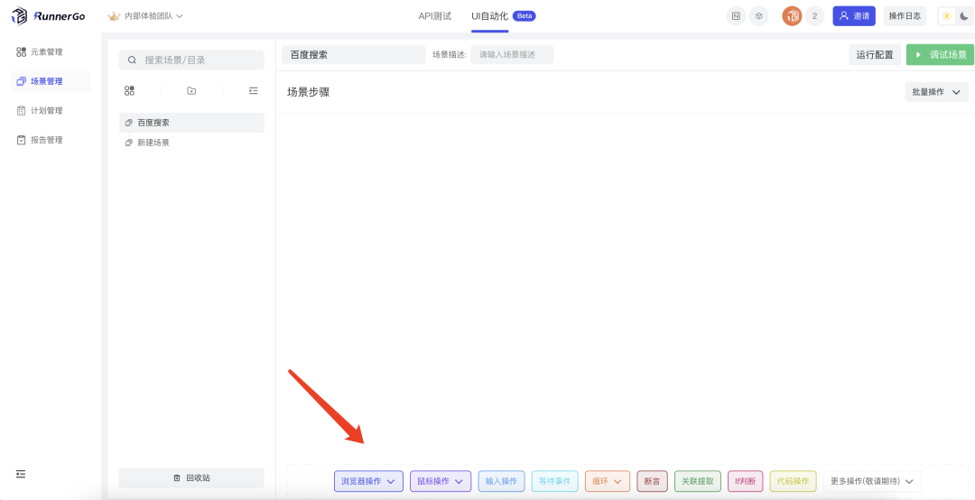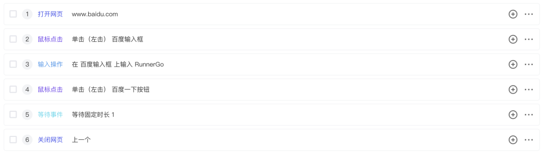 在 RunnerGo 中配置一条如下图的百度搜索测试用例需要怎么操作?本文会介绍RunnerGo UI自动化的配置方法。