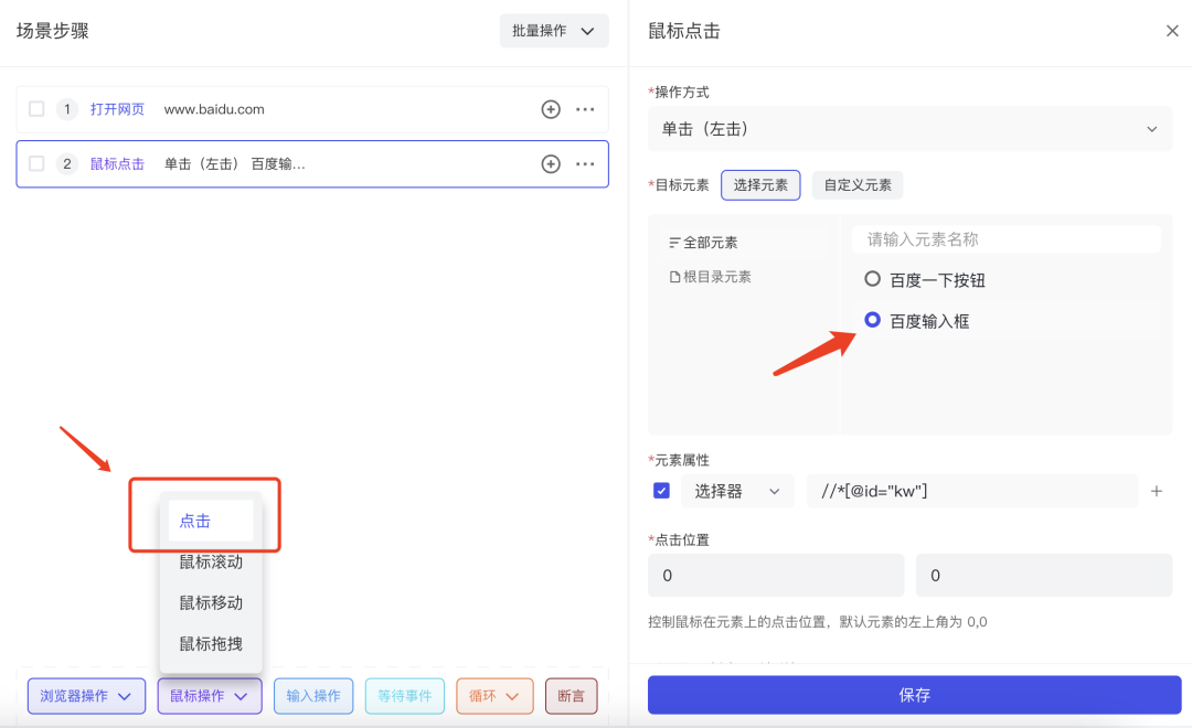 进入到页面后需要点击百度搜索输入框,所以需要添加鼠标点击操作