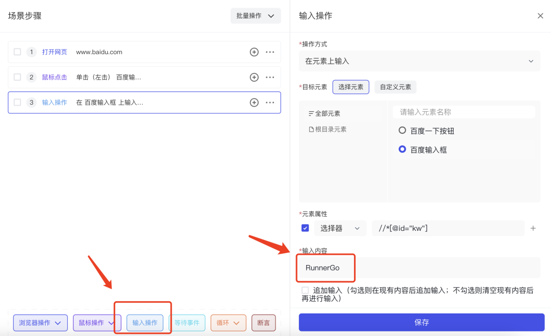 点击输入操作,在下方配置输入内容,我们搜索RunnerGo