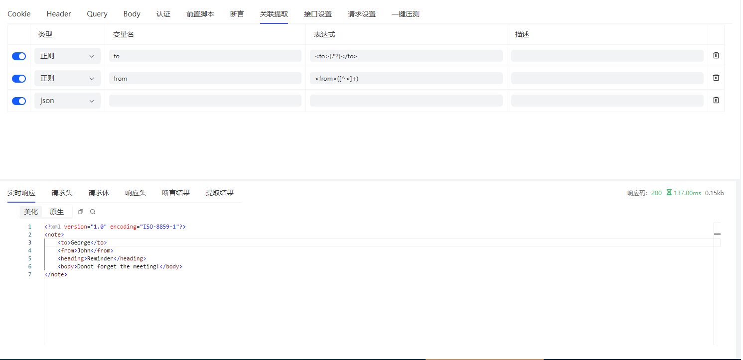一般用于响应结果为非json格式,使用正则提取变量值,表达式为规范的正则语法。